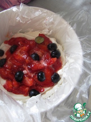Форму, в которой будет находиться чизкейк, выстилаем пищевой пленкой. Укладываем слой творожной массы и ягоды. Затем слои повторяем, пока не закончится начинка.