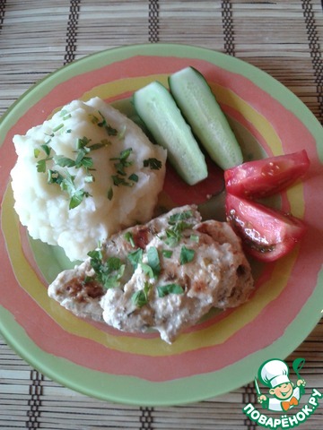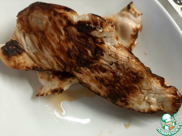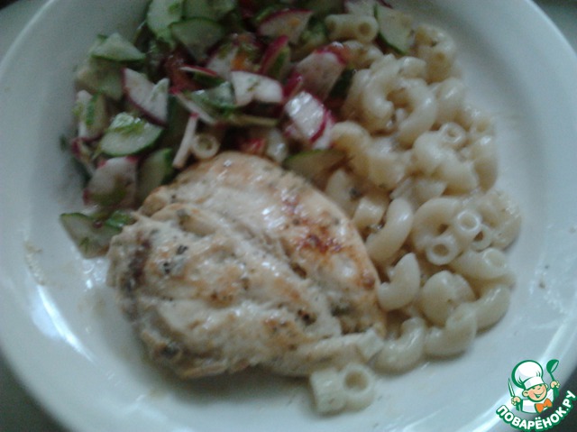 Я уже говорила в одном из моих рецептов, что нам по почте присылают флаеры с рекламой какого-то журнала и включают в него пару рецептов, оказывается, очень хороших рецептов. Я не любитель куриной грудки, но из-за этого рецепта я стала фанаткой куриной грудки :-) Я готовила эту грудку, обжаривая на сковороде, и как шашлык, мясо получается вкусным, нежным и ароматном, не только в горячем виде, но и в холодном, у нас остался маленький кусочек, и я на второй день приготовила из него салат, было очень вкусно!!!