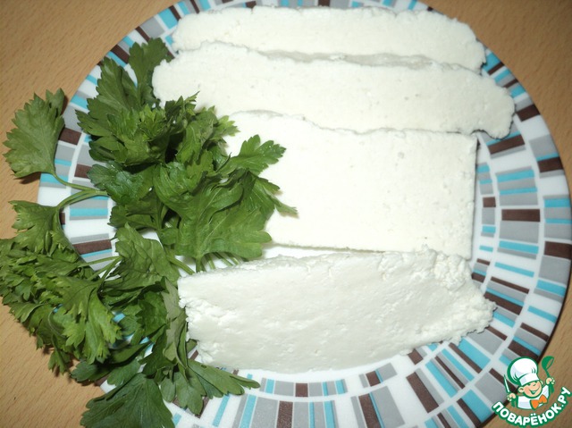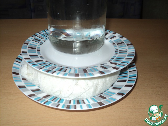Такое "сооружение" у нас стоит при комнатной температуре 2-3 часа. Выделяющуюся сыворотку нужно сливать. Затем "конструкцию" в таком виде убираем в холодильник на 8-10 часов. Наш сыр готов!