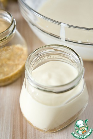 Баночки поместить в глубокий противень с кипящей водой и отправить в разогретую до 170°С духовку. Выпекать 25 минут, пока края не схватятся, а серединка будет еще подрагивать. Остудить до комнатной температуры и поставить в холодильник минимум на 4 часа.