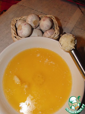 Каждый разрез с помощью ложечки прослоить маслом с травками и чесночком. -