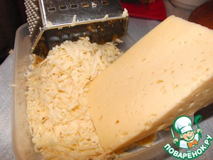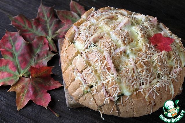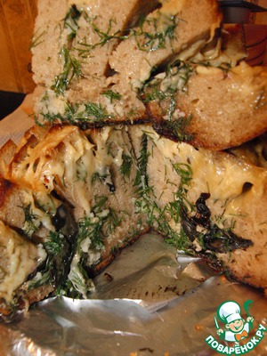 Сразу после трав мы "шпигуем" хлеб мясной начинкой и сыром (я взяла карбонад и натерла его на терке).