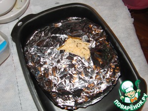 Ставим в духовой шкаф сначала на 20 минут. Через 20 минут раскрываем фольгу для того, чтоб появилась корочка, и ждем еще 10 минут.