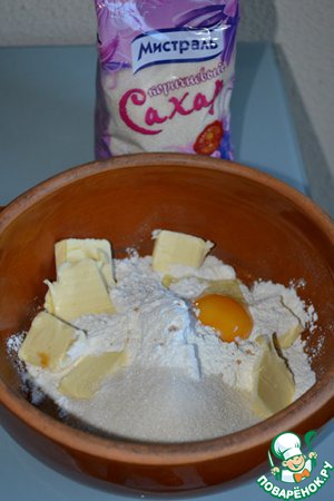 Смешать муку, разрыхлитель, 75 г сахара. Добавить 75 г мягкого масла. Руками начать месить, получатся крошки. Добавить желток, ванильную эссенцию (ванилин) и воду (примерно 2 ст. л.). -