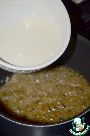 Как только карамель стала темно-коричневой, влить наши горячие сливки в 2-3 приема, хорошо мешая после каждого раза.
