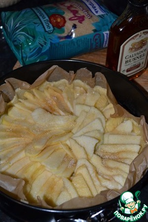 Яблоки выложить на полуготовое тесто, посыпать сахаром по вкусу и побрызгать кальвадосом (можно коньяком или ромом).