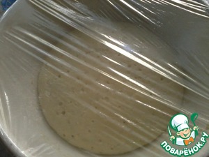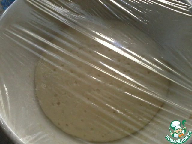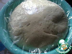 Тесто положить в миску, накрыть пленкой, полотенцем. Поставить в теплое место для увеличения в 2 раза (примерно 1.5- 2 часа). -