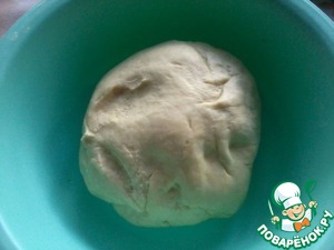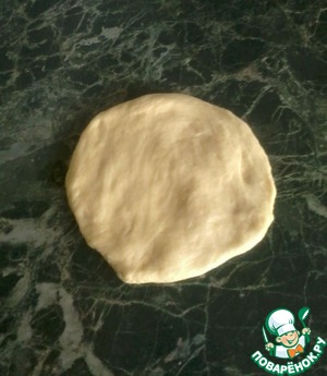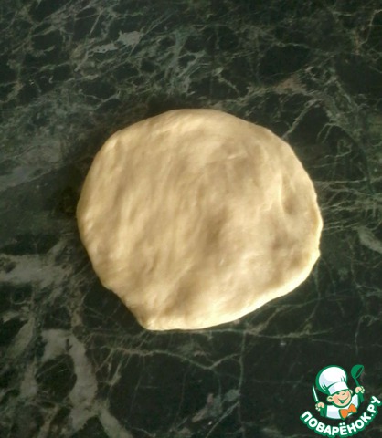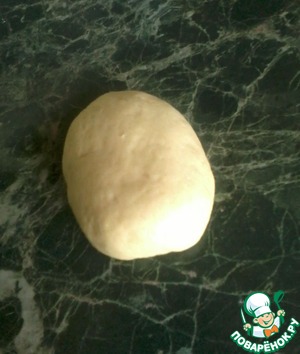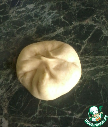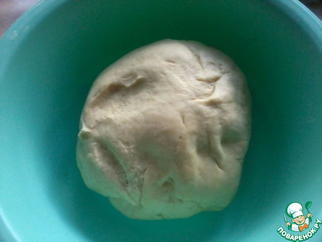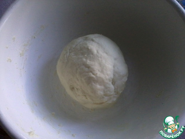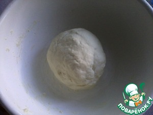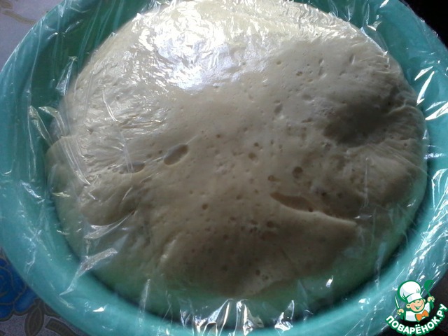 Замесить тесто, накрыть пищевой пленкой (сверху прикрыть махровым полотенцем) и поставить подходить в теплое место для увеличения в 2 раза (примерно на 1- 1.5 часа). -
