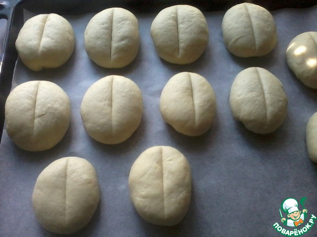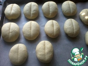 Каждую булочку посередине прижать лезвием ножа, прикрыть полотенцем и оставить на расстойку на 30-35 мин. в теплом месте.