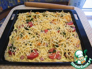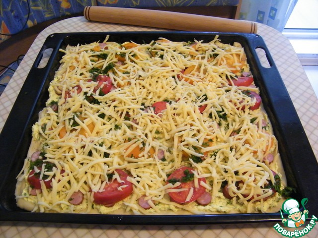 На смоченный холодной водой противень раскатываем тесто нетолстым слоем. Творог смешиваем с яйцами, добавляем чуток зелени и чеснока и кладем равномерно сверху теста. Затем кладем слой порезанных кружочками помидор. Сверху солим, перчим и сахарим и еще посыпаем зеленью. Все сверху укрываем потертым на крупной терке сыром и запекаем в духовке приблизительно 30-40 мин. ( Сегодня, когда пекла пирог, нашла в холодильнике охотничьи колбаски, я их тоже добавила)... Надеюсь, что понравится. Это блюдо чем-то пицу напоминает)