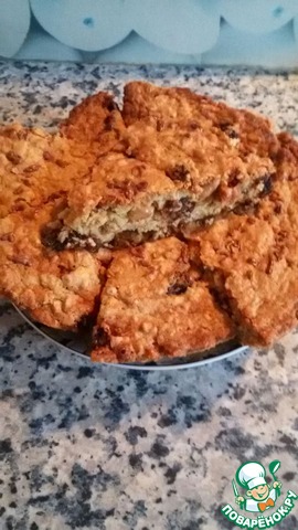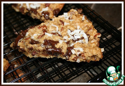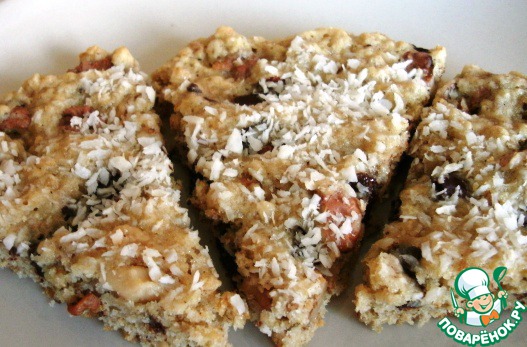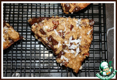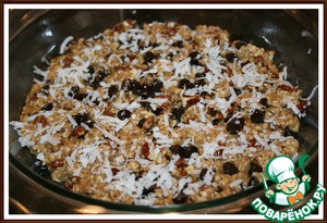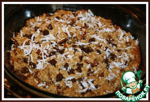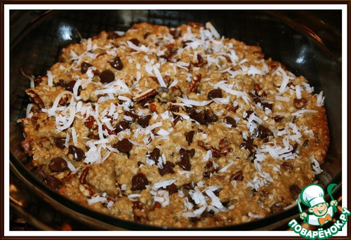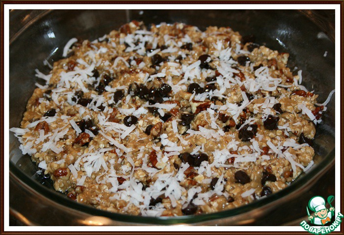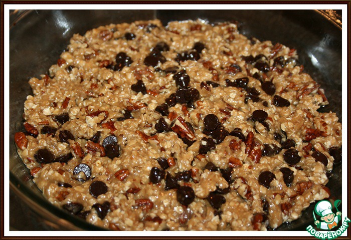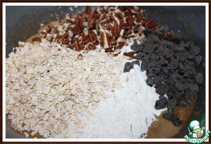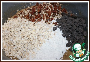2. Добавить к смеси муку, Хлопья овсяные, орехи и шоколад - перемешать до однородности.