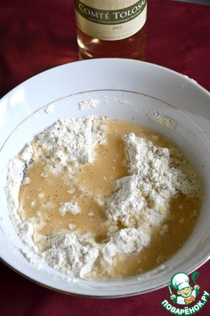 • Затем влить белое вино. Вино может быть любым - сладким, полусладким, сухим или полусухим.