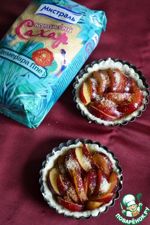 • Выложить сливы на полуготовые тарты, посыпать сахаром по вкусу.