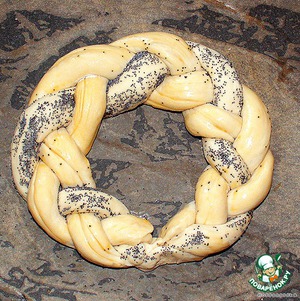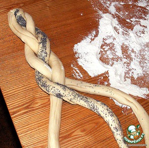 • Раскатываем тесто на три жгутика. Средний мажем белком и посыпаем маком. Закрепляем концы и плетем косичку.