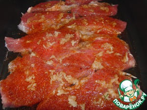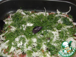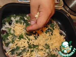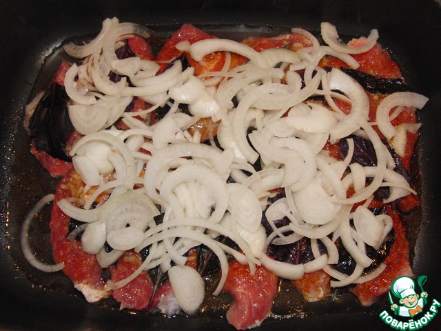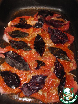 Сверху на чеснок положить базилик целыми листиками (базилик дает пряный привкус мясу и аромат)