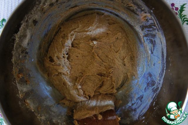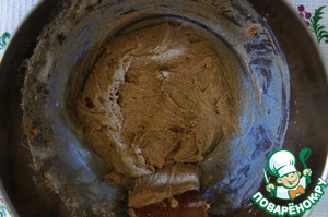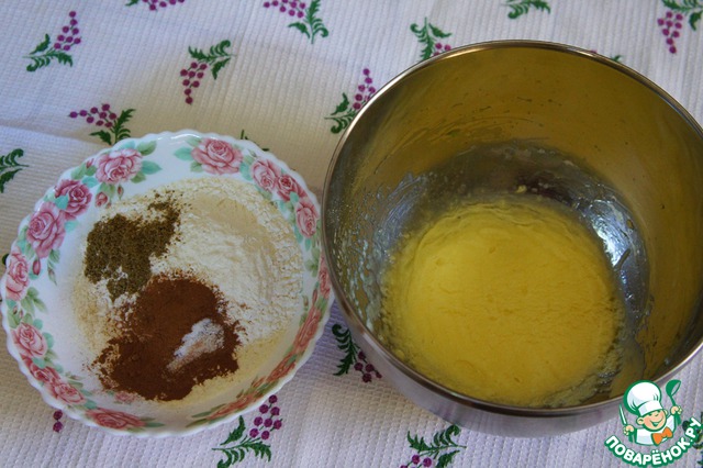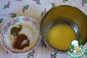 • Просеем 2 стакана муки, добавим в муку 2 ст. л. корицы, 1 ст. л. аниса (порошок), 0,25 ст. л. соли, 1 ст. л. пекарского порошка (разрыхлитель). Тщательно перемешаем сыпучую смесь и смешаем ее с яичной смесью. Деревянной ложкой тщательно перемешаем до однородной массы.