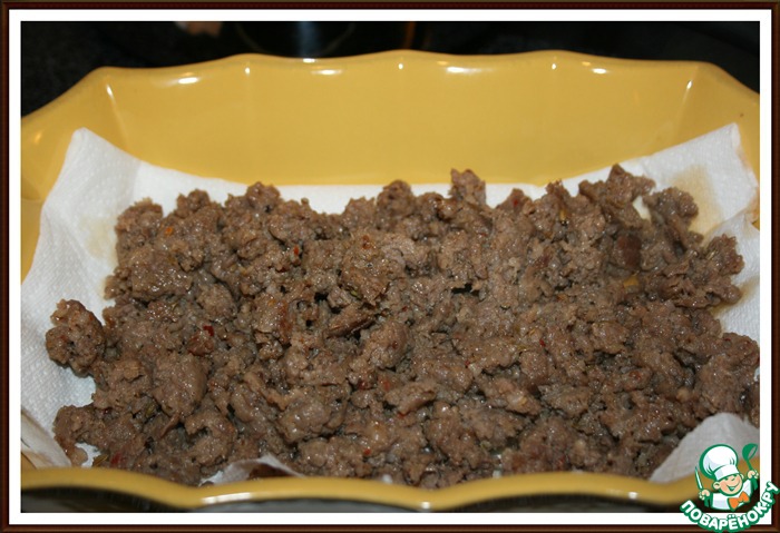 Готовый фарш поставить на салфетки, чтобы стёкло лишнее масло.
