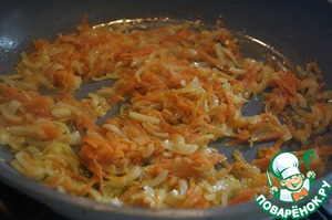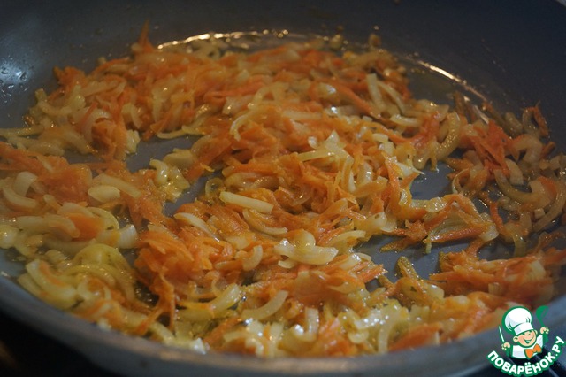 Лук нарезать, морковь натереть на терке, все обжарить на растительном масле до золотистого цвета.