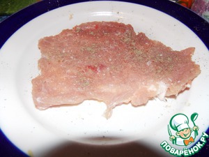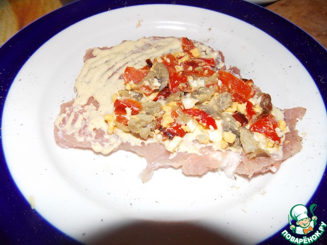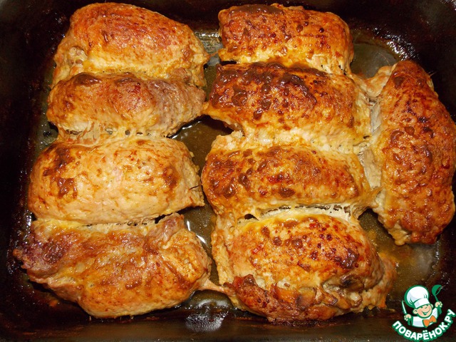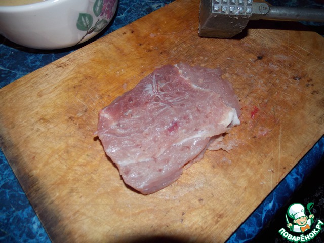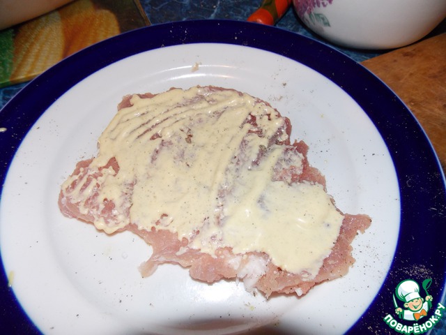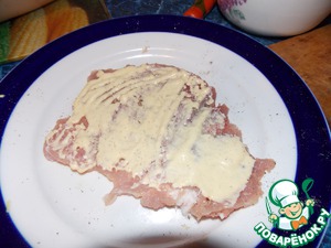 Майонез смешиваем с горчицей - это будет соус, им смазываем мясо.