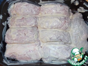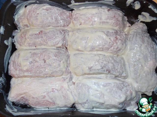 Заворачиваем рулеты. Выкладываем их на противень и смазываем их соусом..