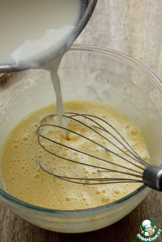 Молоко довести до кипения и "закалить" яично-сахарную смесь вне огня. "Закалить" - это влить небольшое кол-во горячего молока, постоянно помешивая. Потом еще чуть-чуть, ну а затем все остальное.