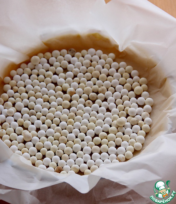 Тесто покрыть бумагой для выпечки, насыпать груз и выпекать при температуре 180г. в течение 10-15 мин. (в зависимости от духовки). Затем немного остудить.