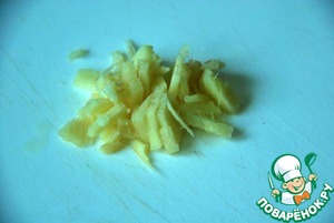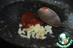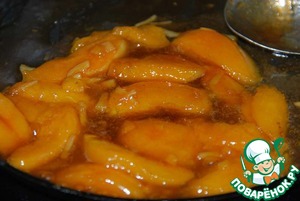 На сковороде растапливаем сливочное масло, добавляем абрикосовый джем, мелко порезанный имбирь и обжариваем пару минут.