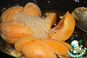На сковороду выкладываем порезанные абрикосы и посыпаем их сахаром коричневым демерара от "Мистраль".
