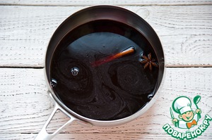 В кастрюлю влить вино, добавить сахар, бадьян и корицу. Довести до кипения, а затем охладить.