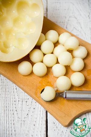 Дыню разрезать пополам, круглой ложкой вырезать мякоть. Сложить в контейнер и хранить в холодильнике до момента подачи на стол.