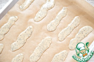 Лист пергамента смазать маслом. С помощью ложки распределите тесто на листе полосками шириной около 1 см и около 12 см длиной. Выпекать в хорошо разогретой духовке около 10 минут.