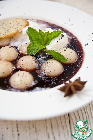 В глубокую тарелку положить несколько шариков дыни. Залить красным вином. Добавить шарик мороженого и посыпать маком.