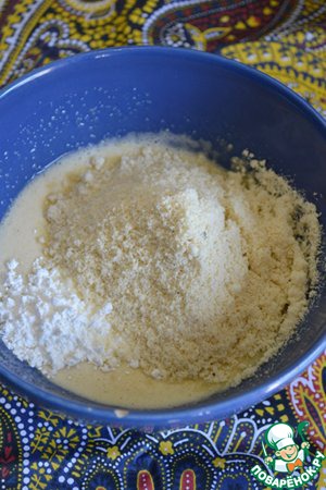 Всыпать крахмал и молотый миндаль. Перемешать до однородности.