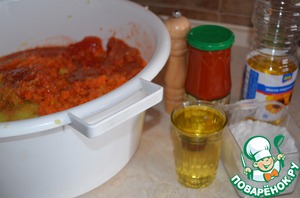 В овощную массу добавляем растительное масло и томатный соус. Я до сих пор твердо уверена, что лучшим соусом для этой икры является соус "Краснодарский", но найти его в наших магазинах почему-то сейчас не смогла. Главное, чтобы соус был вкусный и хороший. Соль по вкусу. У меня ушло примерно 4 ст. л. крупной соли с горкой.