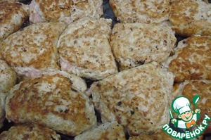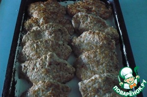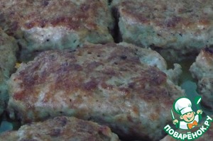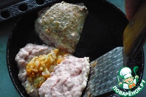 Мы смазываем сковородку маслом, нагреваем и выкладываем куриный фарш овальными лепешками.