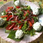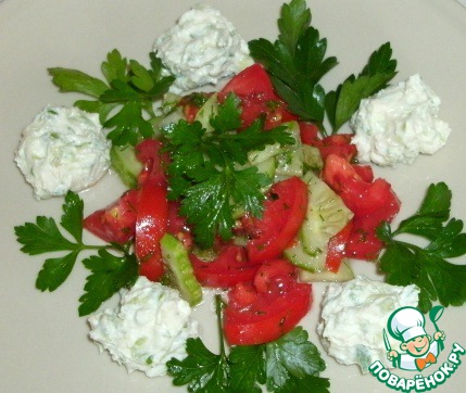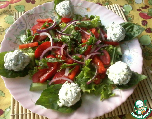 Выкладываем овощи и творожные шарики на тарелку, поливаем заправкой.