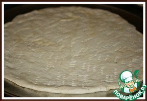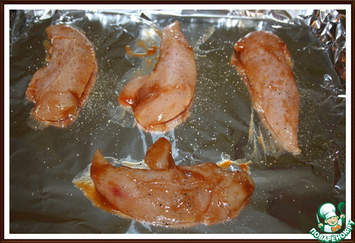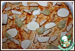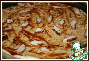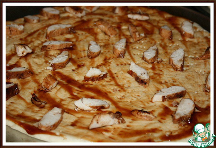 5. Смазать тесто 1/3 стак. соуса барбекю, сверху распределите курочку.