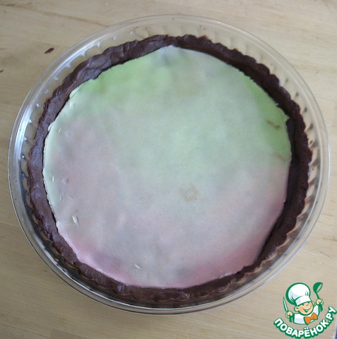 Форму смазать маслом, тесто раскатать в круг и выстелить им дно, формируя небольшой бортик. Если миндальная паста покупная или из холодильника, ее нужно раскатать по диаметру формы и положить на дно, если свежеприготовленная и мягкая, сразу равномерно распределить по дну при помощи ложки. -