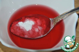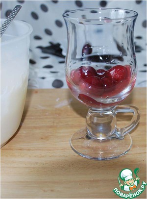 Берём высокий бокал (стакан), на дно кладём полную ложку остывшего черешневого соуса (киселя).