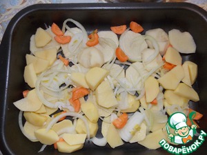 Картошку порезать, выложить на противень смазанный под. маслом, так же лук и морковку и посолить..