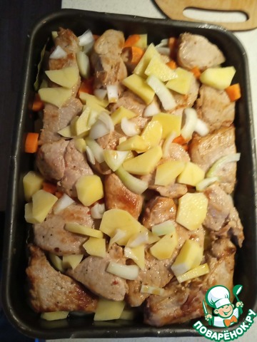 И поставить тушиться все в духовку примерно на час (я смотрела по готовности картошки) при температуре 200 гр.