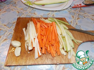 Рисовую лапшу замочить в воде комнатной температуры на 15 минут. Пока лапша размокает, нарезаем овощи соломкой и обжариваем на под. масле (чуть-чуть подсолив). Как прошло 15 минут сливаем воду и заливаем лапшу кипятком еще минут на 5, затем сливаем воду.