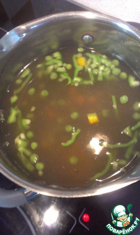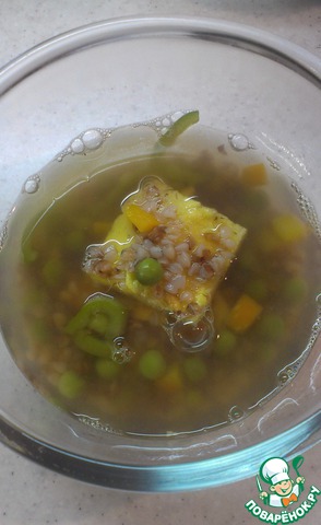 • В кипящий бульон сначала добавляю морковь и горошек, спустя минут 5 перец и гречку, и специи по вкусу, и варю до готовности гречки
