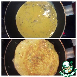 • Тем временем взбиваю яйца со специями, и жарю на подсолнечном масле с двух сторон, получается вот такой вот омлет.