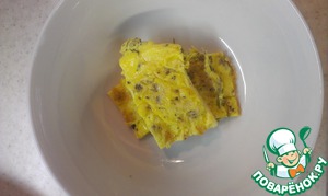 • Далее омлет режу кубиками и выкладываю на дно тарелки