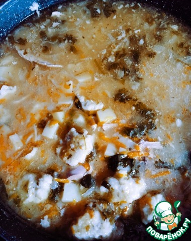 : яйцо + молоко + мука + соль. Отделяя чайной ложкой тесто, соображаем клецки и закидываем их в бульон. Добавляем зелень.