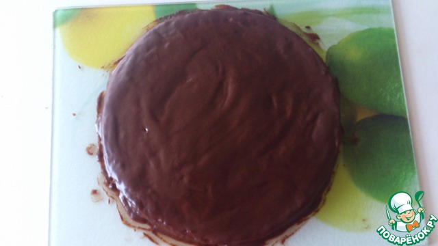 Растопим шоколад с 3 ст. л. воды на водяной бане. Выливаем на "крышу" ложкой примерно половину глазури и разравниваем. Ставим ее в холодильник.
