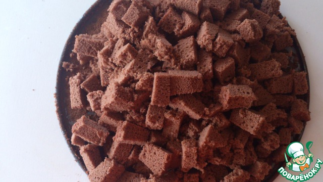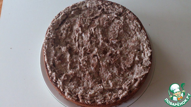 Всыпаем их в крем и перемешиваем нежно, чтобы не получилось каша. Выкладываем в наш сундук, немного промазав бортики, чтобы "крыша" прилипла и не норовила убежать при разрезании готового торта.