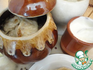 Мясо вынимаем в другую посудину, доливаем к нему два половника бульона.