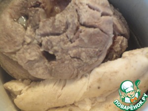 Отвариваем мяско. У меня было два кусочка свиной голяшки и половинка куриной грудки.